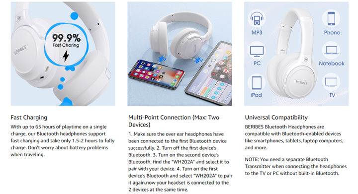 • ?【Latest Bluetooth 5.3 and Microphone】Carrying latest Bluetooth 5.3 chip, after booting, 1-3 seconds to quickly pair bluetooth. Beribes bluetooth headphones with microphone has faster and more stable transmitter range up to 33ft. Two smart devices can be connected to Beribes over-ear headphones at the same time, makes you able to pick up a call from your phone when watching movie on your iPad without switching