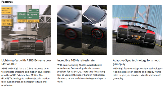 The 24” Asus VG248QG delivers a blistering Fast 165Hz refresh rate and 0.5ms response time to a full HD resolution The ergonomically-designed stand ensures ultimate viewing comfort during gaming while Asus Eye Care technology minimizes eye fatigue Asus exclusive game visual and game plus technologies enhance color performance and control. Viewing Angle (CR≧10): 170°(H)/160°(V).