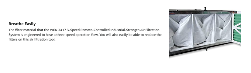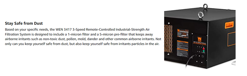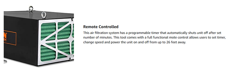 Remember when your workshop was full of clean air? Air-borne dust particulates can dirty up a woodworking space and harm a healthy respiratory system, but with the WEN 3-Speed Remote-Controlled Air Filtration System, you no longer need to worry. This system eradicates these contaminants by catching them in one of the two easily replaced filters while circulating the air in your work area. The powerful 3-amp motor leaves no stone unturned, collecting every contaminant in its path. The quiet system creates 63 to 68 dB of noise and is controllable up to 26 feet away with the included R.F. remote. The included chains and eyebolts make for easy mounting and installation in a variety of wood shops. The WEN Air Filtration System collects and releases the air in your workshop after filtering it through both a 5-micron outer filter and a 1-micron inner filter. Easily switch between three speeds of 556, 702 and 1044 CFM depending on what your situation calls for. With the self-automated timer, you don’t even have to worry about turning off your machine. Simply set the timer to automatically turn the machine off after a certain number of minutes, allowing you to easily give your workshop a thorough cleanse at the end of the day. And because this is a WEN Product, your 3-Speed Remote-Controlled Air Filtration System comes backed by a two-year warranty, a helpful customer service support line, and a stocked inventory of replacement parts. Remember when you could breathe easy in your workshop? Remember WEN.