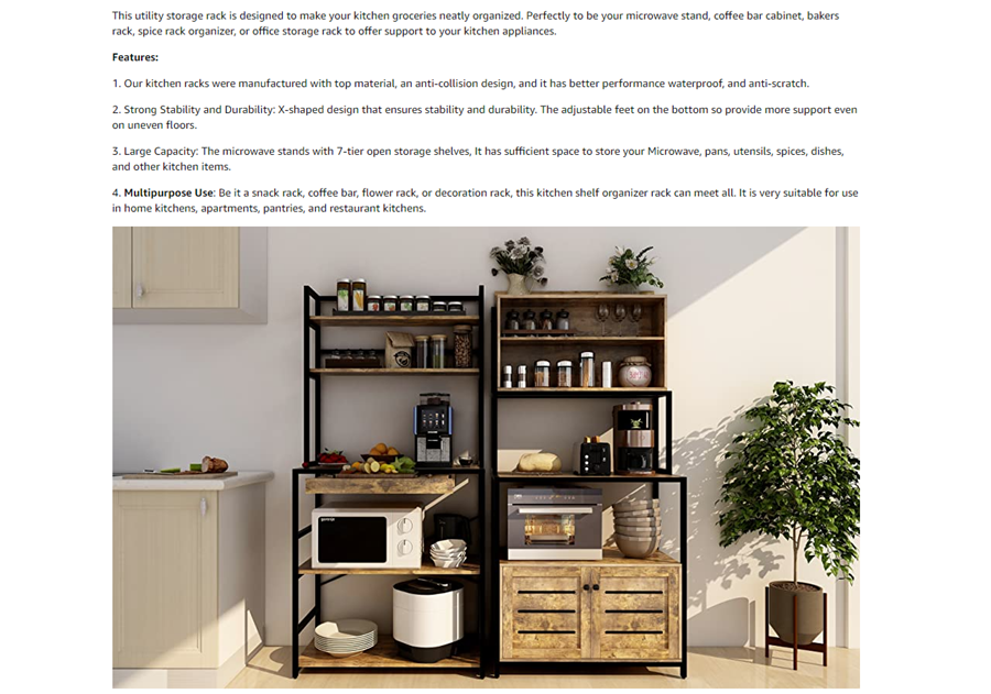 - 【Solid Construction & Reinforced Rod】Strong iron frame and quality chipboard enhance the strength, so you can put all you need on this baker rack. This storage rack is designed to make your kitchen groceries be neatly organized. Perfectly to be your microwave stand, coffee bar cabinet, bakers rack, spice rack organizer, office storage rack to offer the support to your kitchen goods.