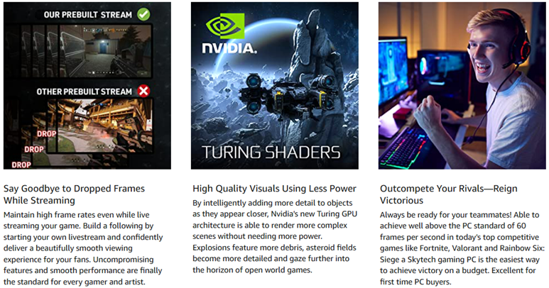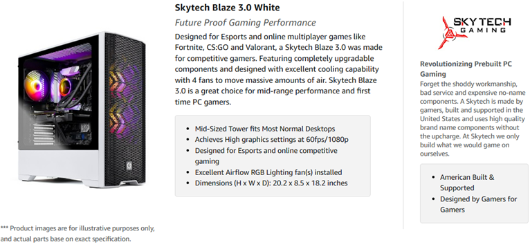 Why settle for mediocrity? Leap forward into Blaze 3.0 series with the newest architectures. Featuring the RX graphics technology and powered by Intel core i5 Processor, the Blaze 3.0 delivers the best price-to-value gaming rig in the market.The Skytech Blaze 3.0 offers the best gaming computer built up to date to easily run popular games such as Call of Duty Warzone, Fornite, Escape from Tarkov, Grand Theft Auto V, Valorant, World of Warcraft, League of Legends, Apex Legends, Roblox, PLAYERUNKNOWN’s Battlegrounds, Overwatch, Counter-Strike: Global Offensive, Battlefield V, New World, Minecraft, Elden Ring, Rocket League, The Division 2, and more at Ultra settings, detailed 1080p Full HD resolution and smooth 60+ FPS gameplay.SPECIFICATIONSProcessor:Intel Core i5-10400F CPU ProcessorMemory:16G DDR4 Gaming MemoryVideo Card:AMD RX 6600 XT (Brand may vary)SSD: 1TB Internal Solid State DriveOperating System: Microsoft Windows 11 Home 64-bitCase:Phantek Metallic Gear Neo Air, White Edition with Front Mesh CasePower Supply:600 Watt 80 PLUS GOLD Certified Power SupplyWiFi:802.11ACFans: Built-in 3 x RGB FansProduct images used on this page are for illustrative purposes only and are not indicative of the exact components used at the time of manufacture. Component makes and models may vary from depictions of the product in product images but will adhere to the specification outlined in the main description of the product. Particulars such as I / O ports may vary.