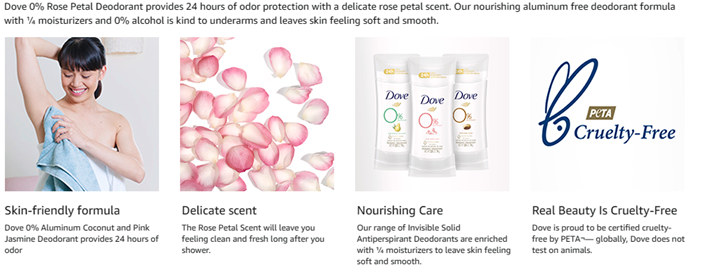 If self-care had a fragrance, what would it be? Our vote goes to delicate, floral scents. With Dove Advanced Care Rose Petals Antiperspirant Deodorant Stick, you can treat your skin and your senses, whenever you need it most. Enjoy the light, flowery scent of rose layered over sandalwood and velvety peach. Wondering how to care for underarm skin? This antiperspirant stick, which is enriched with our signature 1/4 moisturizers with natural oil, gives you noticeably soft skin. With a kind-to-skin formula that contains 0% alcohol (ethanol), it's a great antiperspirant deodorant for irritated underarms. And that's not all. This gentle, non-irritating deodorant stick keeps you protected from sweat and odor for up to 48 hours. Use Dove deodorant for women regularly and you can enjoy beautifully soft and comfortable underarms that stay dry all day long. For best results, apply this Dove antiperspirant deodorant to dry skin after showering and enjoy fresh, comfortably dry skin from morning to night. Dove is certified cruelty-free by PETA because we believe that real beauty is cruelty-free. We're on a mission to help women raise their self-esteem - because we believe beauty should be a source of confidence, not anxiety. Dove Antiperspirant Deodorants deliver effective underarm protection and are kind to skin, so women can be free of underarm inhibitions and live beautifully unselfconsciously.