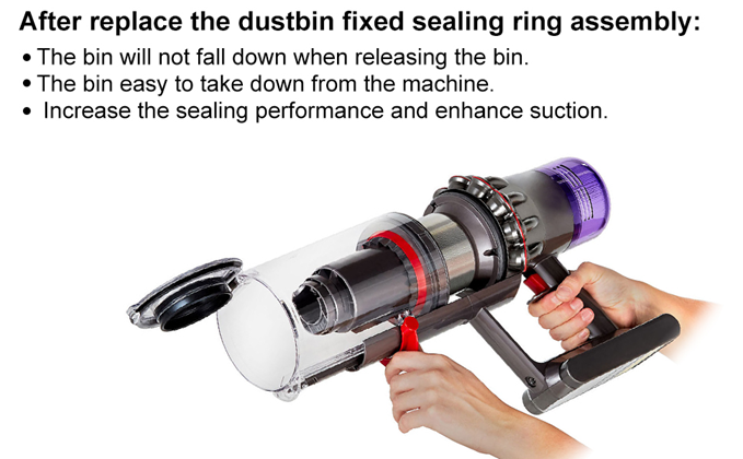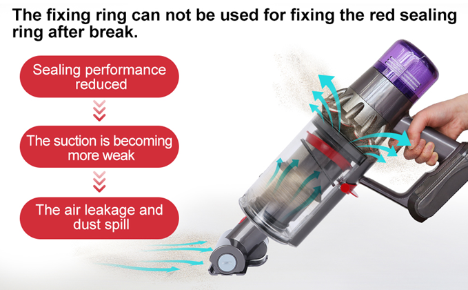 - ?The red sealing ring will be aged after a long time use and it will easily adsorbed on the inner wall of the dust bin, the fixing ring will easy to break and cannot be used for fixing. These problems will cause the bin fall down or difficult to take down from the machine, the dust collection effect also becomes worse. At this time, you need to replace a new sealing ring for your machine.