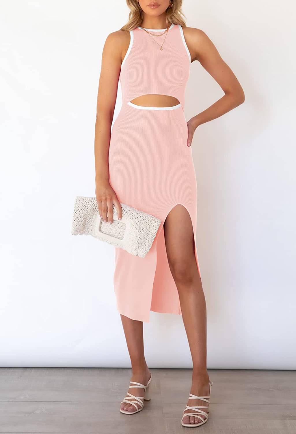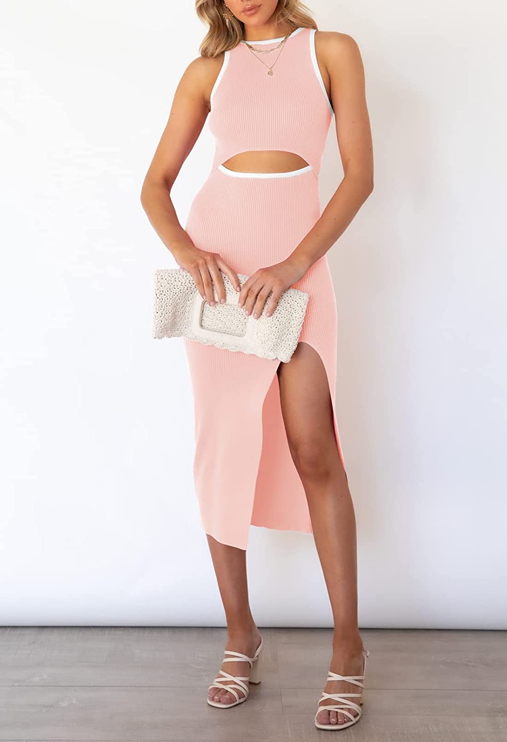 • Sleeveless cutout bodycon dress, solid color and color block, hollow out, slim fit, tank knit midi cocktail dress