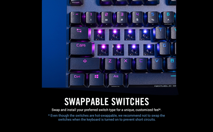 • Swappable switches: Install your preferred switch type for a unique, customized feel