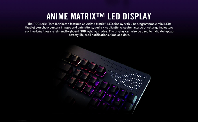 The ROG Strix Flare II Animate is the ultimate gaming keyboard. It’s fully loaded with a host of innovations, including the customizable AniMe Matrix™ LED display, hot-swappable ROG NX mechanical switches, PBT doubleshot keycaps, sound-dampening foam, 8000 Hz polling rate, dedicated media controls and a wrist rest with light diffuser.