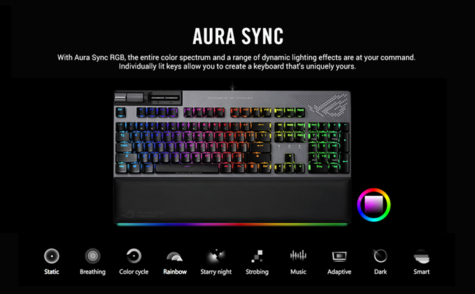 • ROG NX mechanical switches: Fast actuation and ROG-tuned force curves for great keystroke feel and feedback