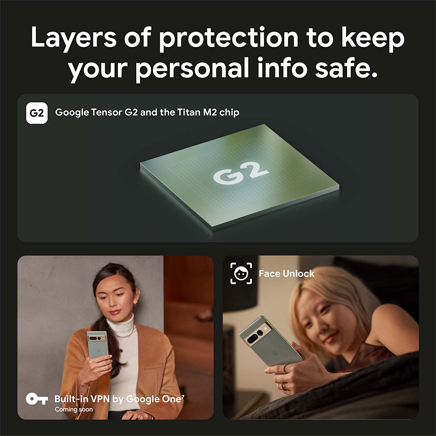 • With Google Tensor G2 and the Titan M2 security chip, your Pixel is built with multiple layers of security to help keep your personal info safe