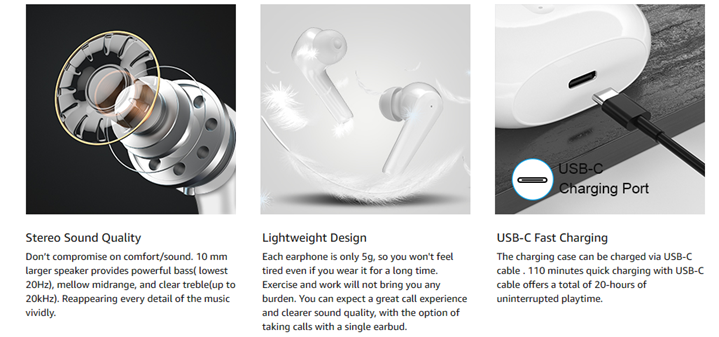 • ♫【20 hours of battery life】: A single earphone could be used for 3.5 hours, and the charging box could provide 20 hours of battery life for the earphones. Could provide you with music all day long. USB C charging gives 2 hours of playback in just 10 minutes. It only takes 90 minutes to charge the charging case from 1% to 100%.