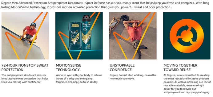 Freshen up, power up and move with confidence with Degree Men Advanced Protection Sport Defense Antiperspirant Deodorant. Supercharged with 72-hour odor protection, this antiperspirant deodorant for men works as hard as you do and provides superior motion-activated protection from sweat and odor. However you move, this antiperspirant deodorant delivers unstoppable freshness for that shower-clean feeling all day long. With a rustic, manly scent and nonstop odor and sweat protection, this Degree Men antiperspirant deodorant won't let you down – so you can stay fresh, for all the ways you move. Our MotionSense® technology doesn't stop working no matter how much you move. It works with unique microcapsules that sit on the surface of your skin. This powerful antiperspirant deodorant responds when you need it most, so that you can stay confident without having to worry about slowing down. Whether you're having a long day at work, playing sports, working out in the gym, or whatever the day throws at you, you can be confident you'll be protected from sweat and odor by this antiperspirant for men. This antiperspirant deodorant stick works as hard as you do, keeping you protected, so you can keep moving and stay active.