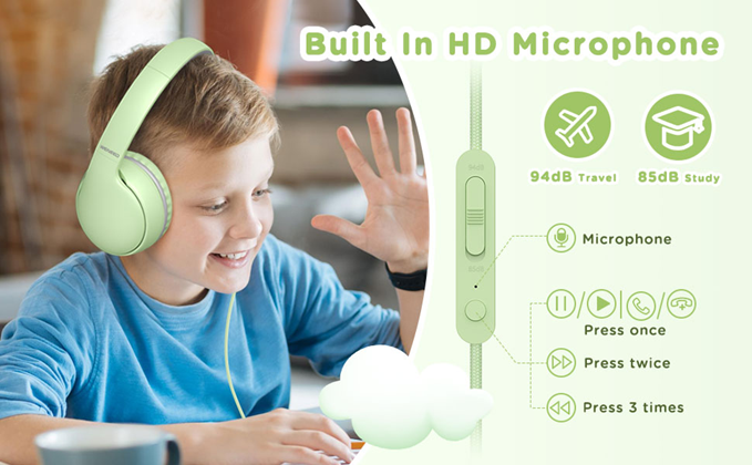 Our toddler headphones have built-in HD microphones that are perfect for online learning, chatting, video calling, and gaming. Kids can switch 85/94dB modes according to different environments, which can not only feel the clear sound but also protect their hearing
