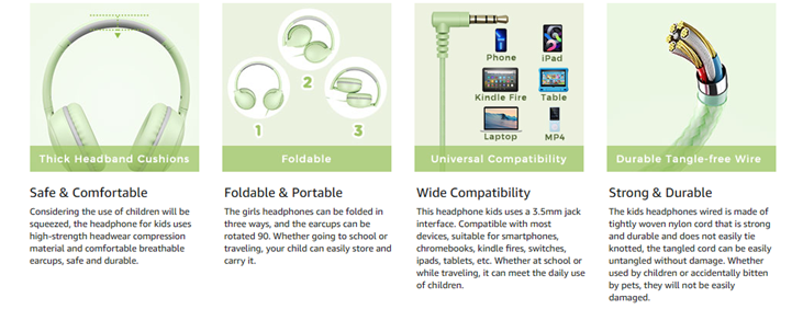 Note: Products with electrical plugs are designed for use in the US. Outlets and voltage differ internationally and this product may require an adapter or converter for use in your destination. Please check compatibility before purchasing.The whole body of the headphones for kids is made of Kids-Friendly materials, and there are no sharp edges and corners in any components, so there is no need to worry about safety problems in children's daily use.