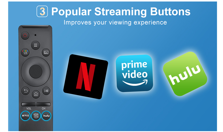 • 【Key Features】The remote control is designed with 3 popular streaming buttons, including NETFLIX, Prime-video and hulu, you can switch to your favorite application conveniently. Pleae noted that this is a infrared remote control and it doesn't come with voice function.