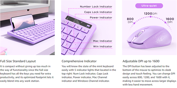 - Productive and Aesthetic -- Improve your computing experience throughout the day with the responsive and well-shaped keys of the purple wireless keyboard. Refresh your workspace with the modern contours and sleek lines in a romantic peach taro purple color, the cute keyboard and mouse will be a fantastic ornament to complement a lovely and contemporary desktop!
