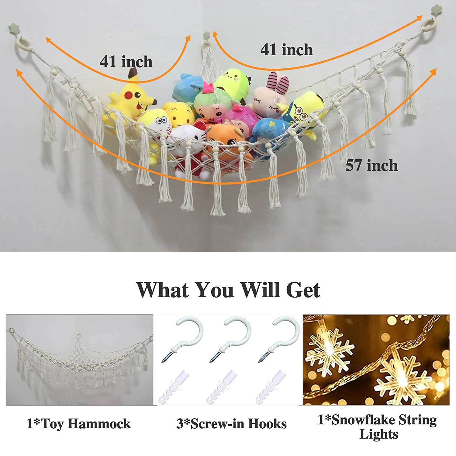 【Animal Hammock Set】you will receive a large toy hammocks, a 5 feet long LED snowflakes lights and 6 pieces of screws and wood hooks. It is an interesting way to display animals and also exercise children's organize skills. NOT including batteries, PLEASE prepare 2pcs AA batteries yourself.
