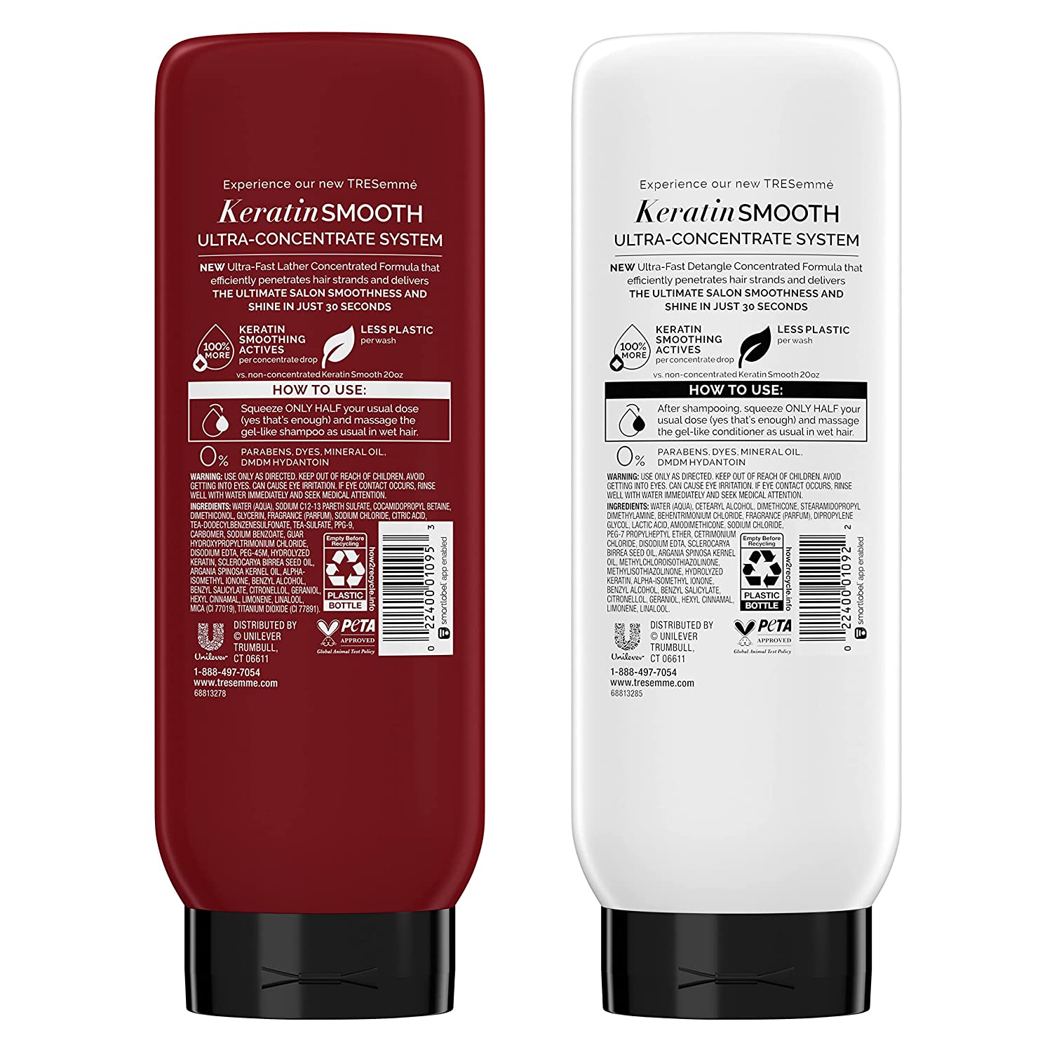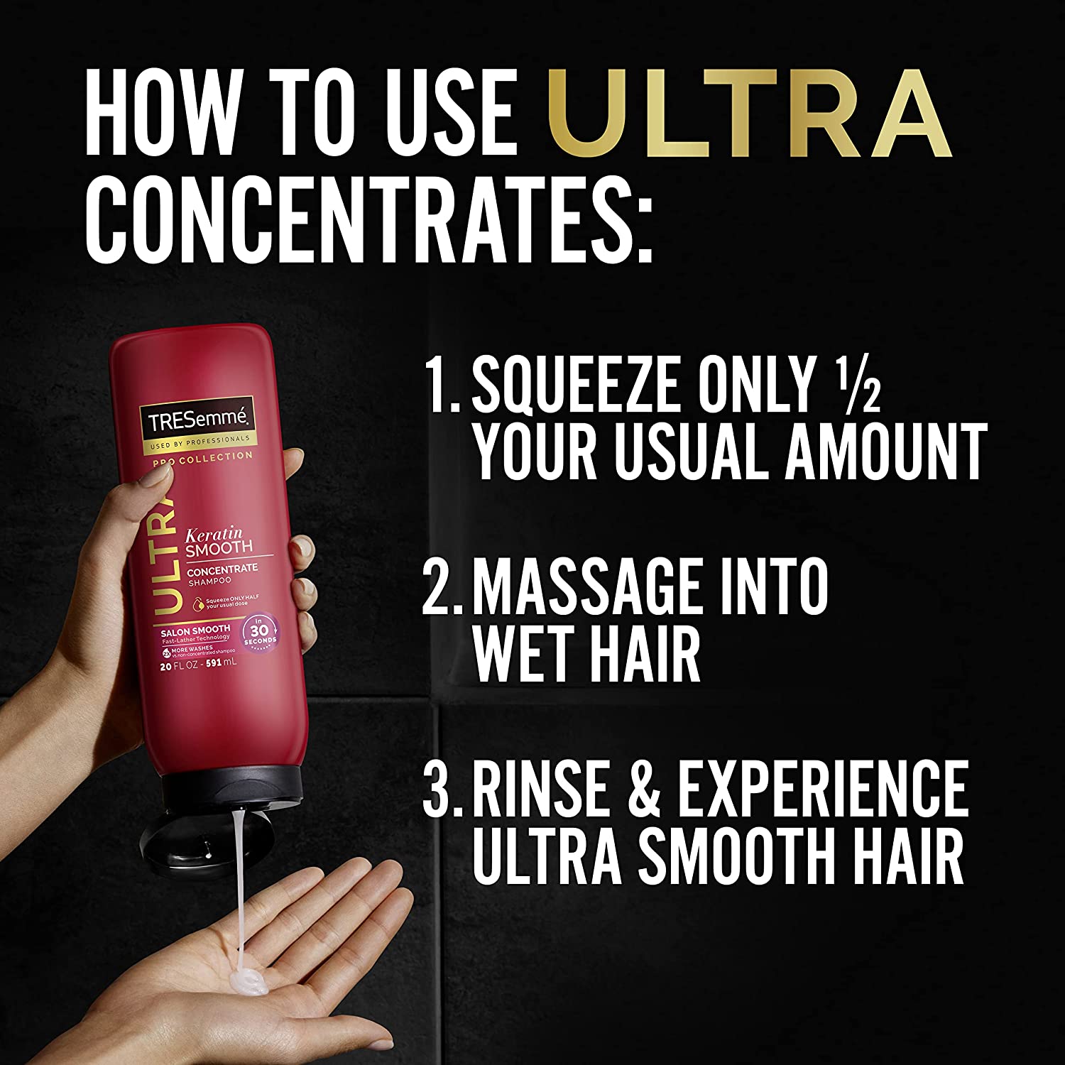 TRESemmé Ultra Keratin Smooth Concentrate System delivers salon-level smoothness and shine in 30 seconds and transforms frizzy hair. This shampoo and conditioner system delivers 2X more washes* and contains 2X the keratin smoothing actives per concentrated drop.