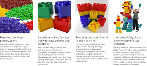 Jumbo Blocks are proudly made in the U.S.A with durable Polypropylene washable plastic material. The oversized and interlocking blocks have smooth round edges for safe for endless play possibilities. Our Blocks are made with safe and unique plastic. Easy clean up just wipe off with a clean wet towel for continuous creativite play. The Super Deluxe Blocks included are 63 pcs Large (8"x4") Blocks and 49pcs Small (4"x4") Blocks in a variety of colors (Red,Green,Blue and Yellow). Colors may vary