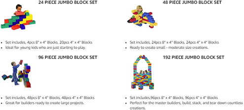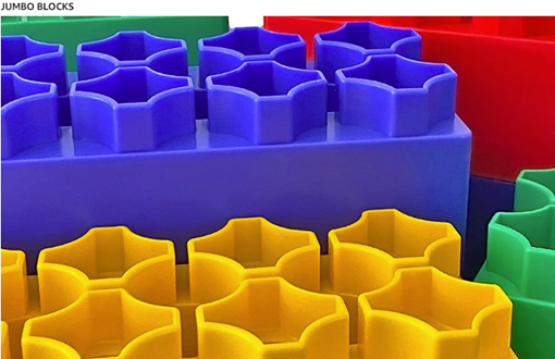 Jumbo Blocks are proudly made in the U.S.A. with durable Polypropylene plastic. These oversized and interlocking blocks have smooth rounded edges for a secure play environment. With unlimited designs and endless play possibilities children can build, stack and tear down for hours to come. Ensuring the development of gross motor skills, the blocks come in two sizes and a variety of set sizes.