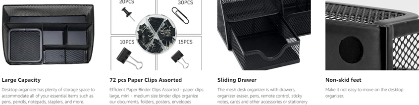 • 【Large Capacity]Our desk organizer for storage has ample space for all your desk supplies. With 6 compartments for pens and pencils, a sliding drawer that can be arranged to suit your needs, and additional storage for paper clips and other small items, this desk organizer has everything you need to stay organized.