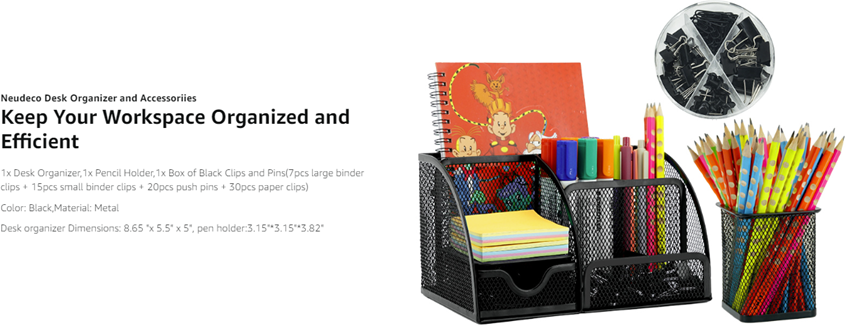 • [Office Desk Organizers and Accessories] Neudeco is proud to release our new desk organizer, perfect for all your office supplies. With multiple compartments, a drawer, paperclip holder, and pen organizer, this desk accessory is designed to keep your workspace organized and clutter-free.