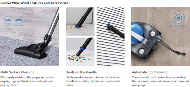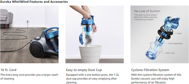 • Easy-To-Use: Spend more time cleaning and less time struggling with your vacuum cleaner. The Eureka whirlwind has automatic cord Rewind, saving your valuable time. The whirlwind has a 1 button release for easy dust cup emptying