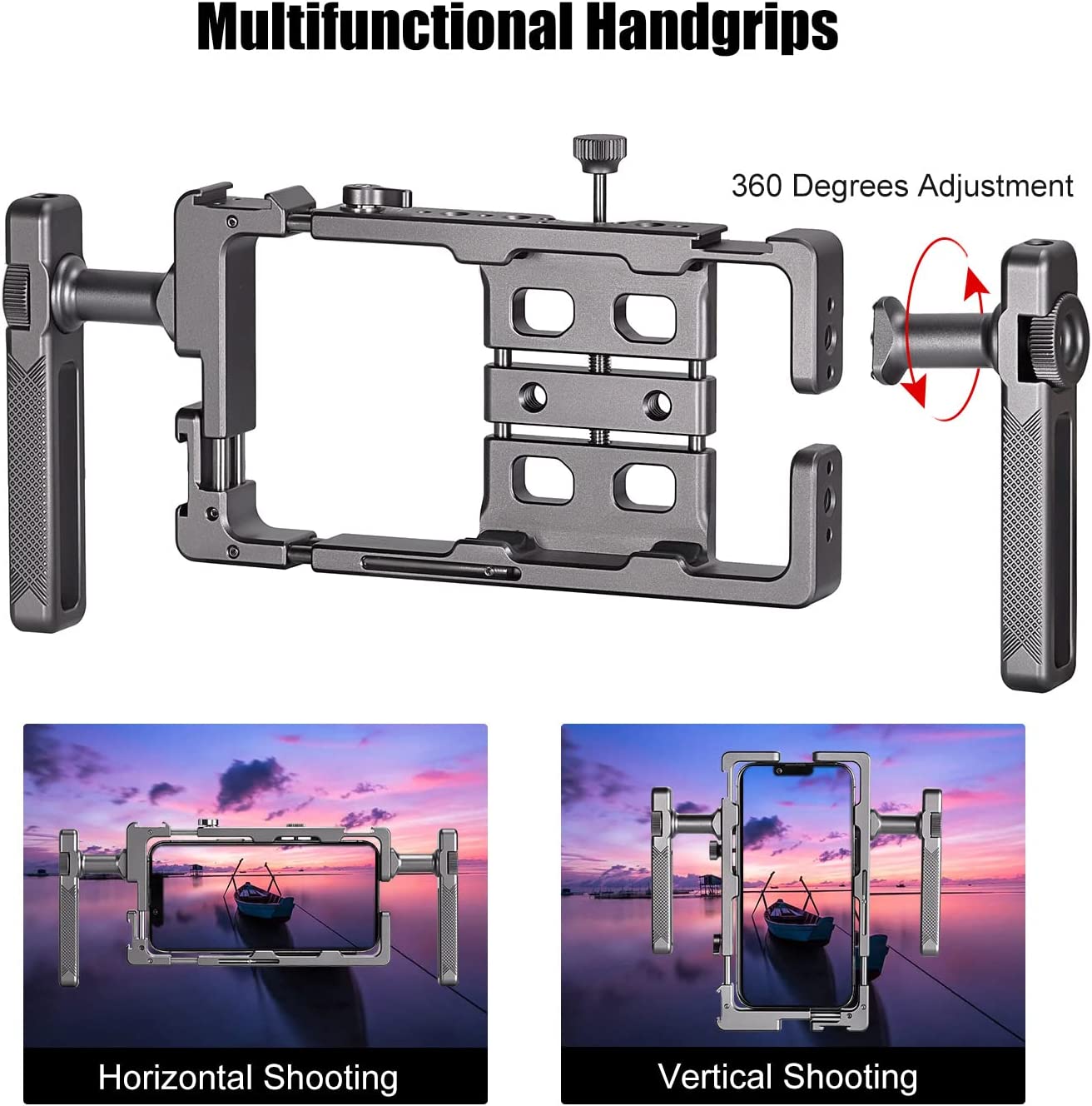 Multi-functional Handle Design: the handles can be detached and reattached on either side of the mobile phone for shooting horizontally or vertically as desired. By turning the direction of the handle, it works for carrying the phone easily during continuous long time shooting.