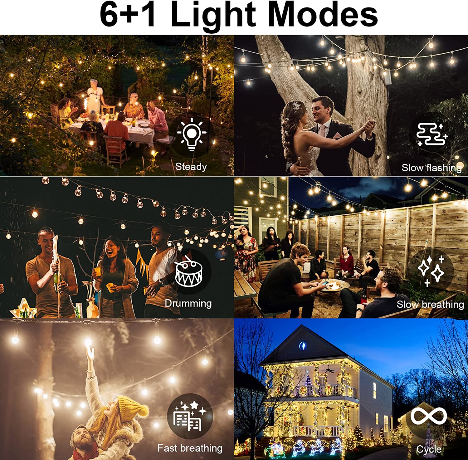 • ?【 6 IN 1 LIGHTING MODES 】15 pcs solar outdoor LED string lights give out 3000k vintage style soft warm white color, not too bright or too dim. Preset 6 lighting modes, simple short press the on/off switch on the back of the solar panel, you can chose best preferred modes to meet your own mood, perfect ambiance string lights for outside Party, Wedding, BBQ, Dinner, Camping etc in Christmas, patio, yard, porch, deck, balcony, garden, bistro, pergola, gazebo, market, cafe, tent, swimming pool.