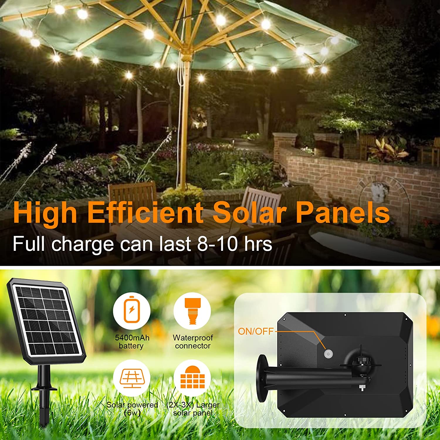 • ?【 ULTRA LONG & ENERGY SAVING 】52 Feet super long solar outdoor string lights, solar powered, really energy saving ! 6W detachable high efficient solar panels ( 2X-3X bigger than other competitors) enables the solar outdoor string lights up to 8 hours working time after full sunny day charging. Simply press on/off switch located on the back of solar panel and keep it in “on” position, the solar outdoor string lights comes on automatically when it gets dark outside and last 8-10 hours.