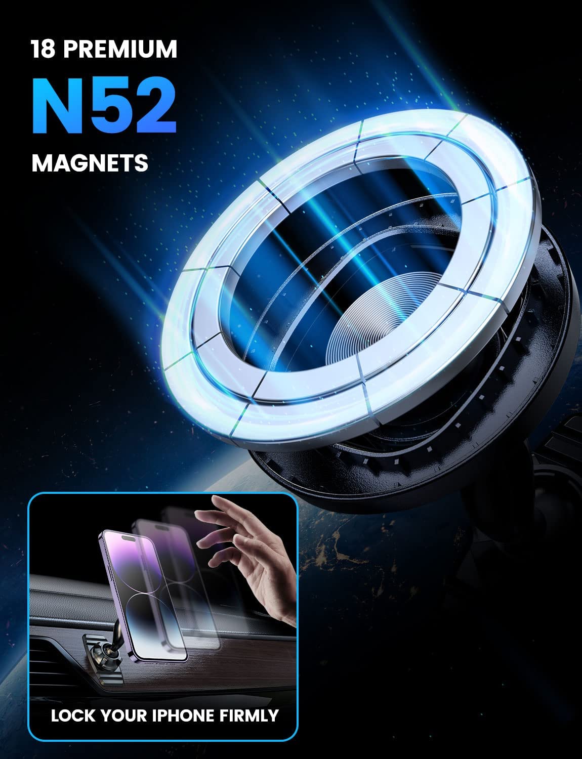 • ?【Dual 360° Rotating Car Mount】: Our eSamcore magnetic phone mount is equipped with new double 360°swiveling ball joints; it allows the iPhone car mount to be adjusted for more viewing angles. So you can place this MagSafe car mount on the top position or low position of the dashboard wherever you like.