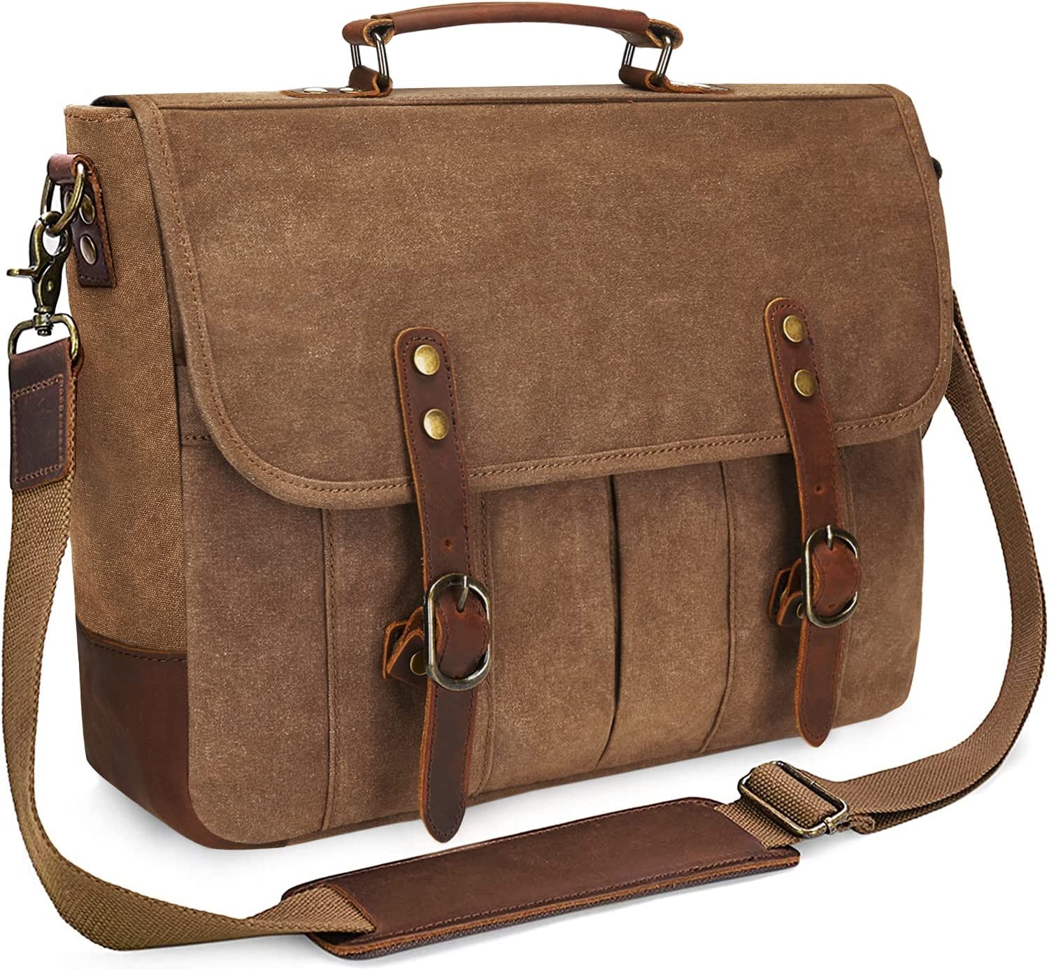 Mens Messenger Bag 15.6 Inch Waterproof Vintage Genuine Leather Waxed Canvas Briefcase Retro Office Computer Laptop Bag Large School Satchel Shoulder Bag for Men Women, Brown