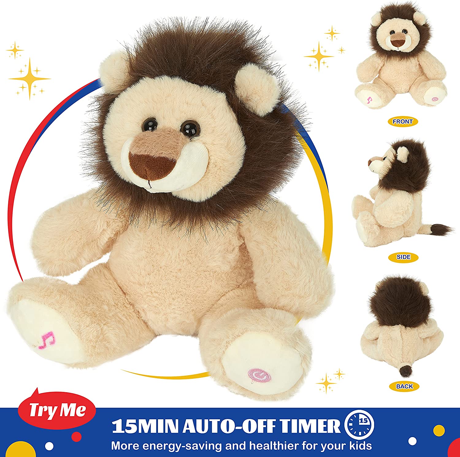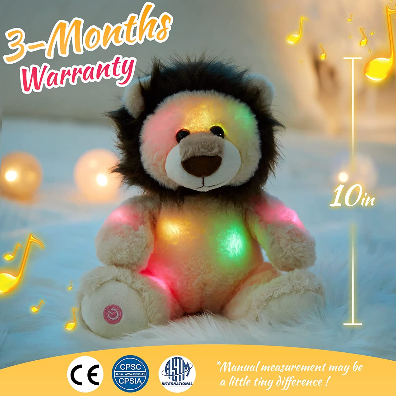 10 LULLABIES INSIDE-There are 10 nursery songs inside the lion stuffed animal: Mary Had a Little Lamb, Rain Rain Go Away, Twinkle Twinkle Little Star, Five Little Monkeys, Hickory Dickory Dock, The Wheels on the Bus, Do Re Mi, Fishing Fishing, If You are Happy and You Know It. All of the sings are sung by clear voice, your kids can learn to sing with the lovely friend. Play with the lion during the day and at night.