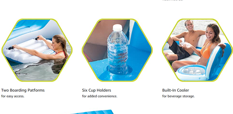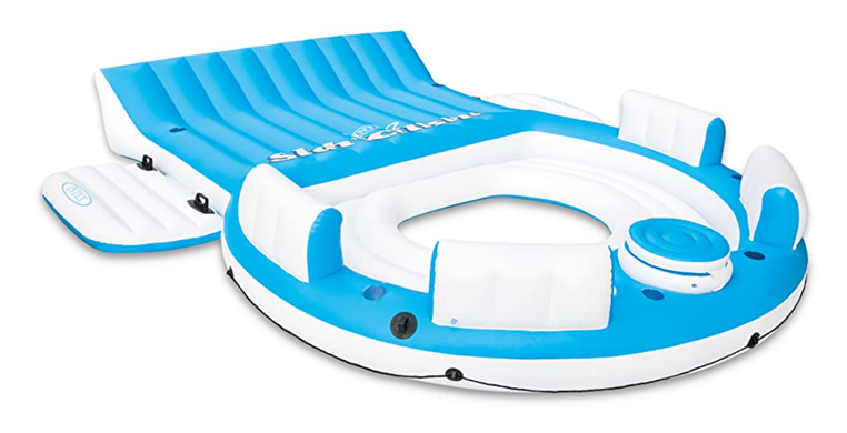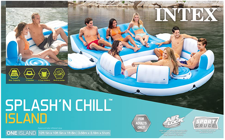 The Intex relaxation island is an inflatable water raft that can seat you and 5 of your friends for a great day out on the lake. There are 6 cup holders and a built-in cooler to keep drinks on hand for everyone. The center of the float does not have a mesh floor so you can stick your feet in and cool off. If you're still feeling hot, hop into the water and hold onto the boarding platform's grab handles. You can bob alongside the float. Oversized backrests made the ride extra comfortable for 4. The other riders can lay out and get some sun on the Float's deck. Included is an anchor bag that you can fill with sand to keep the float moored and a repair patch kit in case you hit some rough seas. Have a blast out on the water this summer with your friends and family with the Intex relaxation island. Product features: super-sized inflatable floating island accommodates large families or lots of friends. Engineered with a perfectly contoured and angled 3 person lounger for sun tanning. Features four upright seats with comfortable back rests and open floor swim-through access. Two inflatable swim-up boarding platforms are used to get on and off the float. Includes: 6 cup holders, built-in cooler, handy grab rope, and anchor bag.