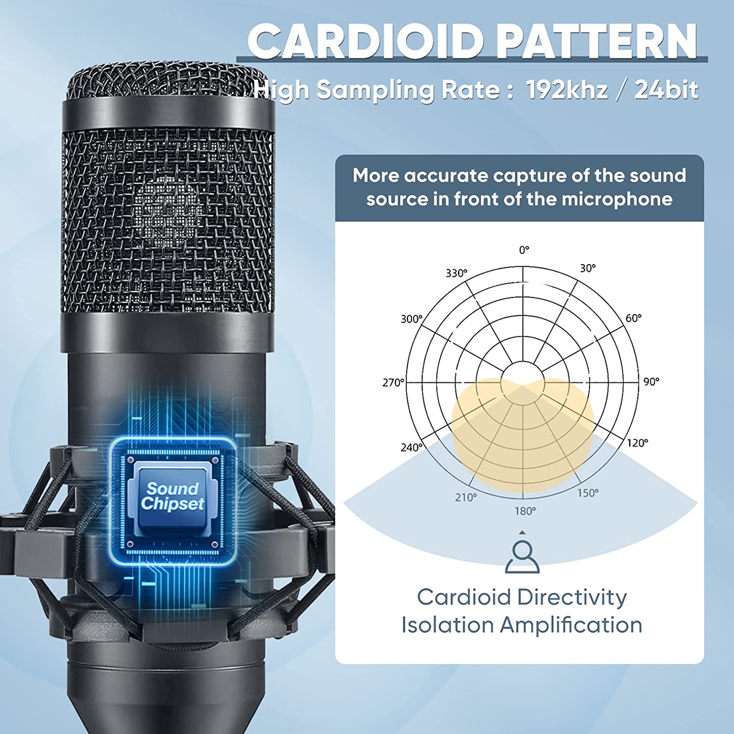 USB Microphone, This Condenser Microphone has been designed with professional sound chipset,16MM mic capsule design delivers rich, detailed sound. Supports sample rates up to 192kHz/24bit. Wide frequency response, and high sound pressure level enable the mic to obtain more real and delicate sound.