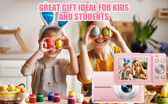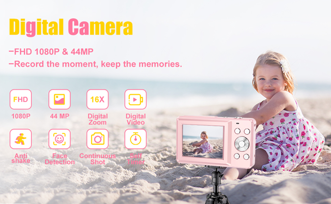 - [1080P 44MP FHD Digital Camera] This kids camera featured with 1080P FHD video resolution,44MP (max) picture pixel, largely enhancing image clarity, compare with other kid cameras. This children mini camera supports 16X digital zoom, you can zoom in or out images by using the W/T button. The pause function allows you to pause when record or playback videos. And the built-in fill light helps you to take quality pictures in the dark.