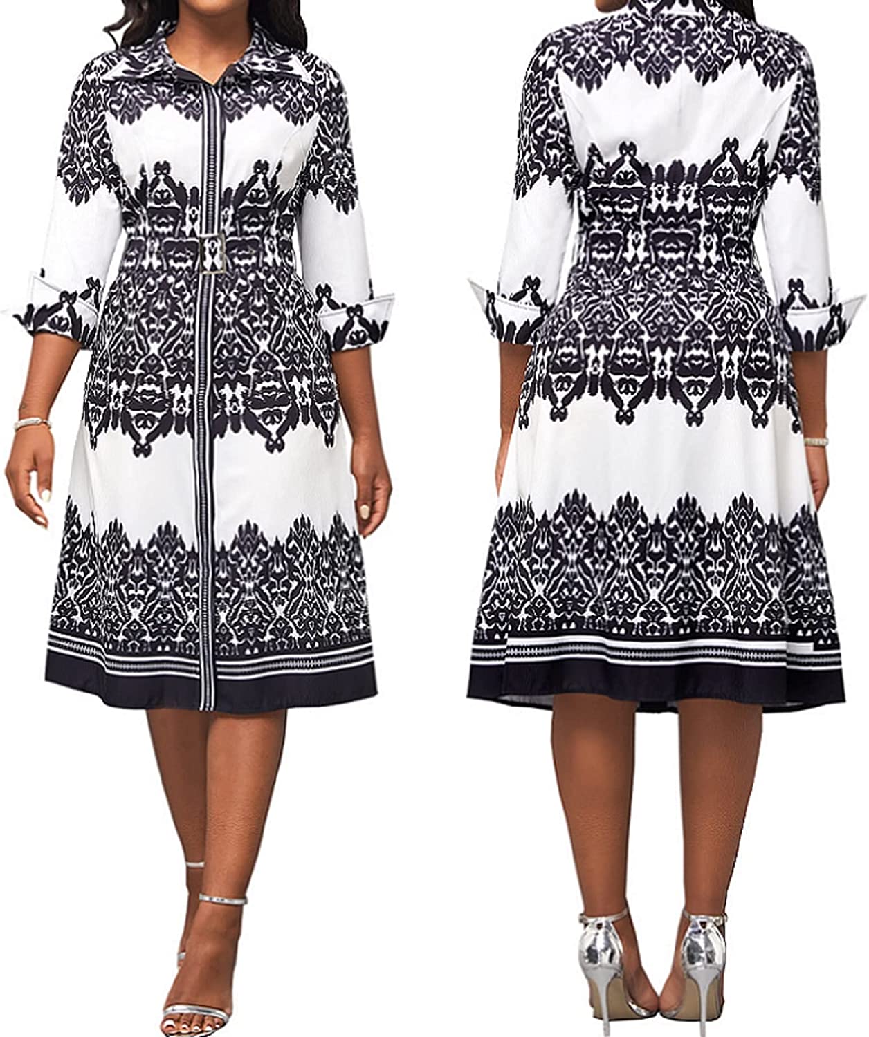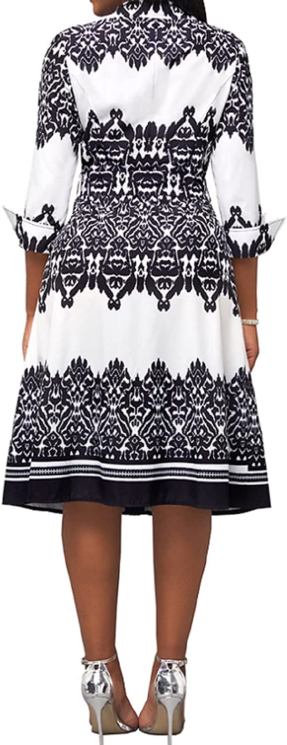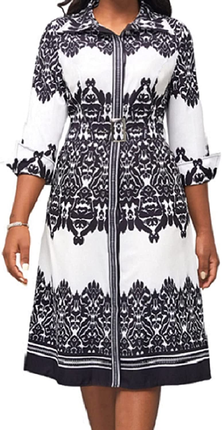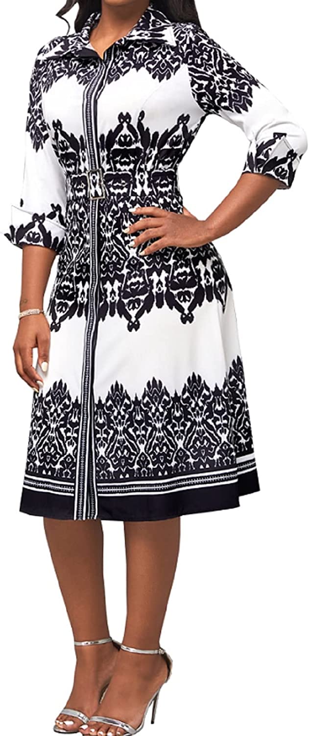 • Women Button Down Dress features v neck,shirt collar,3/4 Sleeve,with Belt,printed midi pencil dress.