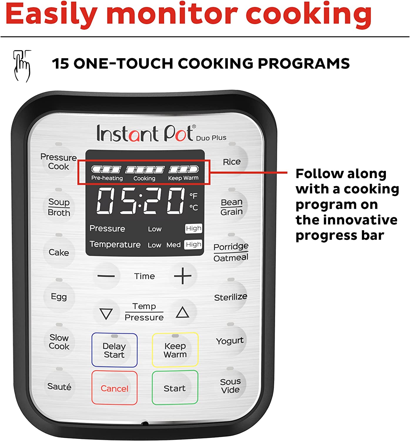 • REALTIME FEEDBACK: The easy-to-read display includes a full cooking progress bar lets you know what stage of the cooking program you’ve reached.