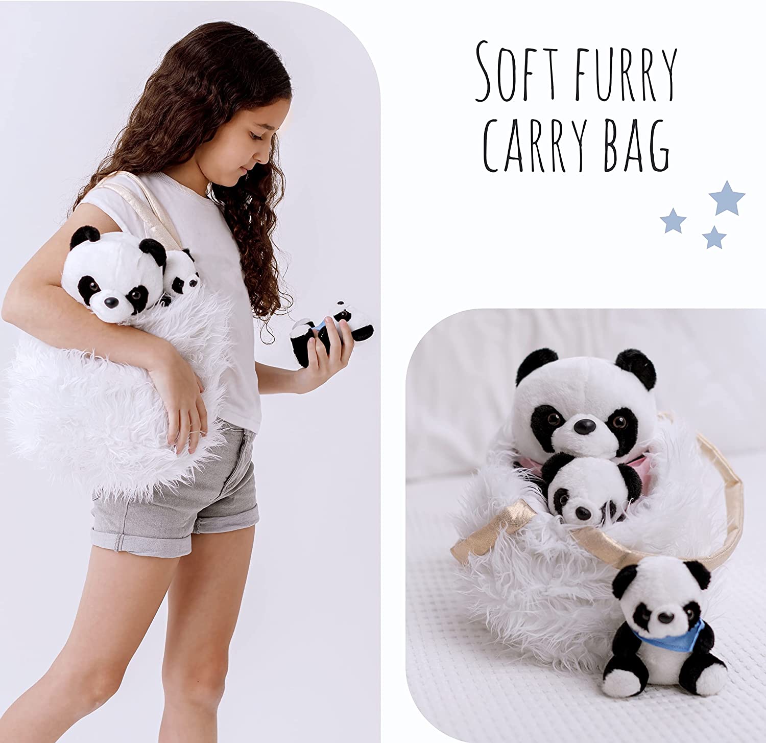 Panda Toy for Girls 5 Pcs Set. Mommy, 2 Baby Panda Toys, XL Furry Bag and Baby Blanket. Cute Plush Gift Set 3 4 5 Year Old Girl, Stuffed Animal for Little Girls. Birthday, Christmas Age 3-8