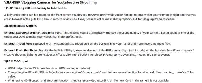 - ?Perfect Gift?: This point and shoot camera with compact size(0.57LB, 4.3*2.96*1.2 INCH) is so lightweight and portable. Pefect for amateurs and beginner photographers to take it around(NOTE: Not professional cameras). Easy to use makes it an ideal camera gift for beginners, kids, teens, students, elderly to take pictures and record, a perfect Christmas or birthday gifts for all ages, a perfect vlog camera for festivals, sports events, weddings or parties.
