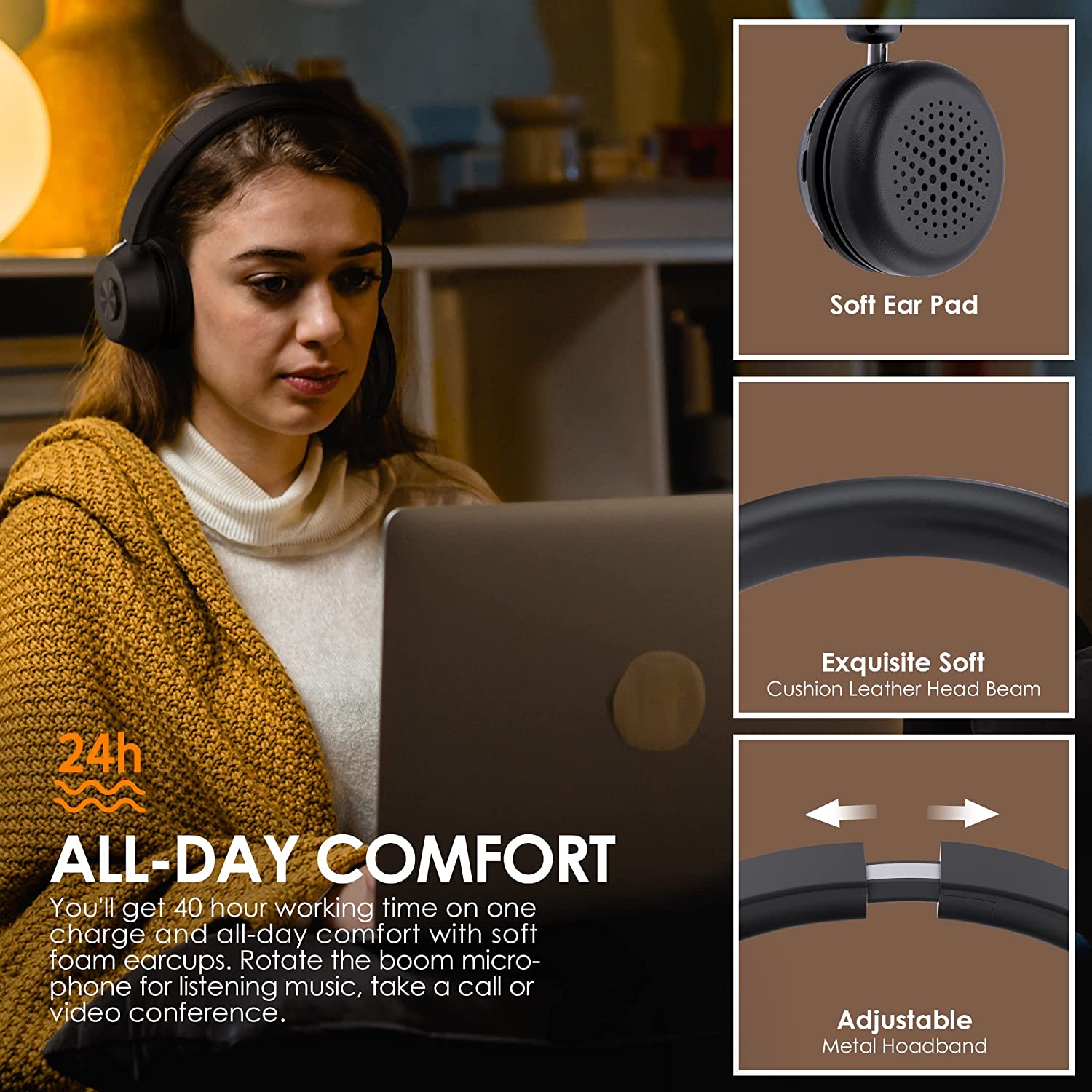 Bluetooth Headset V5.1, Wireless Headset with Noise Canceling Microphone, 40 Hrs Work Time Office Headset with Bluetooth Dongle & Charging Base, AptX HD On-Ear Headphones with Mute Button