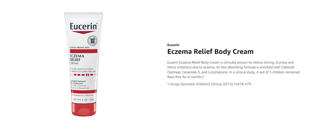 Eucerin Eczema Relief Body Cream is a clinically proven moisturizing formula that relieves and fortifies dry, itchy, eczema-prone skin. This fast-absorbing skin cream for eczema is formulated with colloidal oatmeal (a skin protectant), Ceramide-3 to lock in moisture, and Licorice Root Extract to help soothe irritated skin. This eczema cream is fragrance free and steroid free, and delivers 24 hour hydration. Eucerin Eczema Relief Body Cream is gentle enough for everyday use, and is appropriate for use on adults, children and babies 3 months and older. In a clinical study, with daily use, 4 out of 5 children remained flare-free for 6 months (1). For Eczema flare-ups, use Eucerin Eczema Relief Flare-Up Treatment Cream. Eucerin is a dermatologist-recommended skin care brand that is based on an uncompromising approach to science. With skin care products designed to restore and sustain healthy-looking skin, families everywhere look to Eucerin to enhance outer beauty and self-confidence. (1) J Drugs Dermatol Children’s Clinical (2015);14478-479.