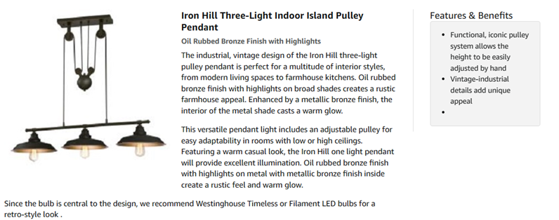Industrial yet vintage, the iron Hill three-light island pulley pendant blends perfectly with any style, from modern to Farmhouse. Oil rubbed bronze finish with highlights on broad, metal shades create Rustic appeal. Finished in a metallic bronze, the inside of the shades create a reflective two-tone appearance and enhance the soft warm glow of this pendant. This vintage-style pendant light includes a functional pulley system which allows height adjustment by hand. Add an iconic conversation piece over a kitchen island, pool table or dining room table. Ideal for a range of home styles, including Arts & Crafts, industrial loft, and vintage Farmhouse. Westinghouse is a trusted, global brand. Westinghouse knows lighting and offers products with exceptional quality, reliability and functionality. Product reference number 63325. Back Plate Height (inches): 4.75,Back Plate Width (inches): 14.56,Cord Length (inches): 30,Bulb Base: E26 (Medium)