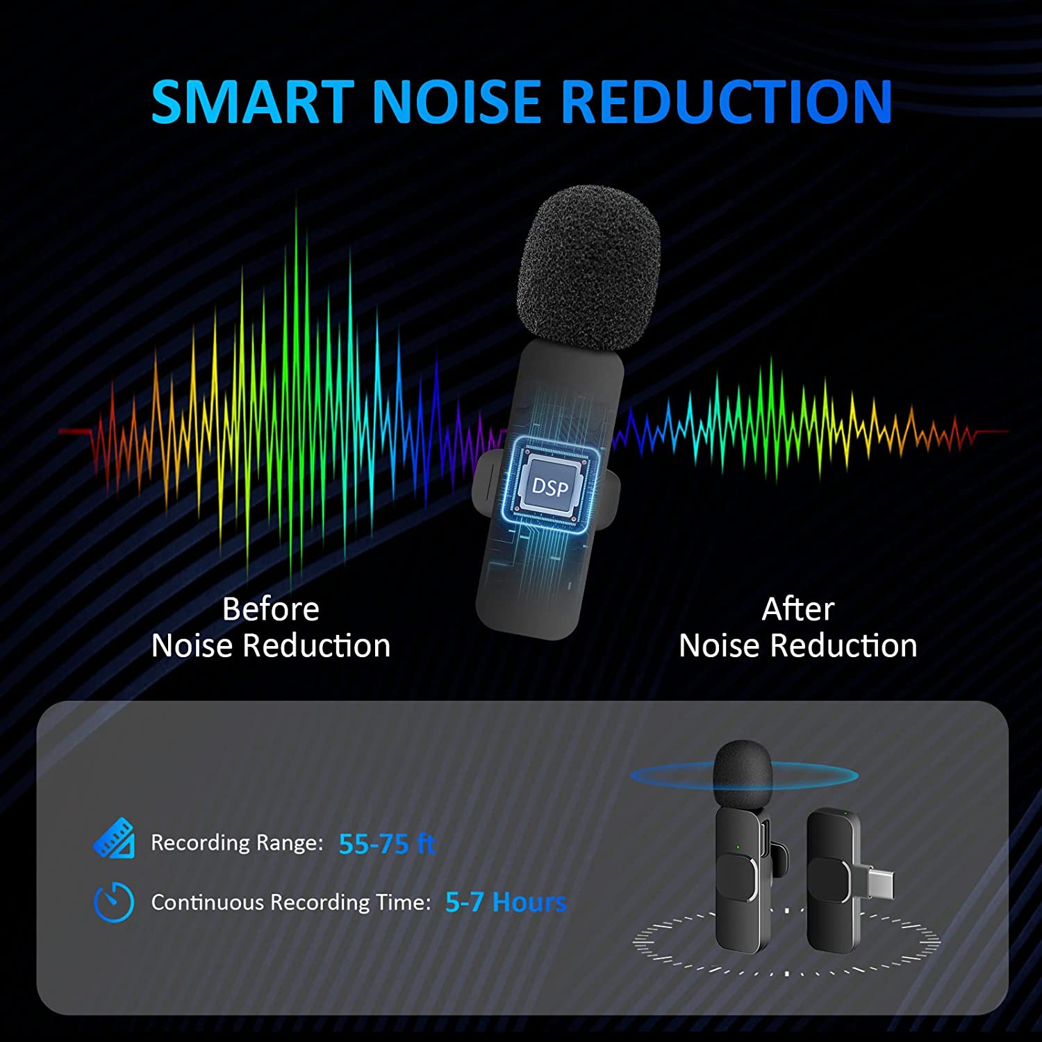 ?【75ft Distance & 7H Battery Life】2022 Upgraded wireless microphone transmission technology, transmission distance up to 75 feet. The NO Bluetooth lapel microphone with a built-in large-capacity rechargeable battery, and up to 7 hours of operating time, you can charge your device at the same time when using a mic for iphone video recording.