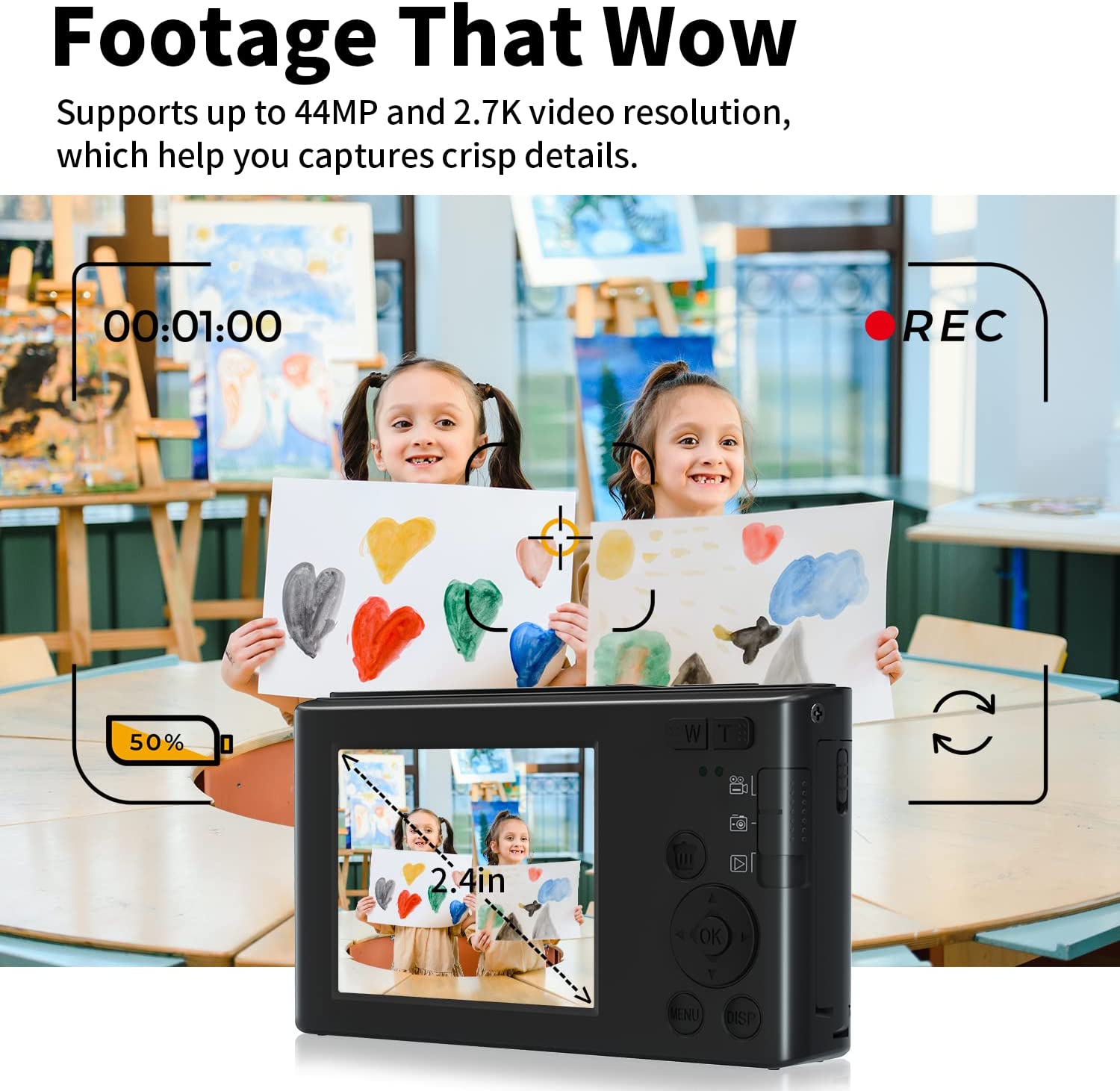 - 【16X Digital Zoom & 2.4" IPS Screen Vlogging Camera】NIKICAM kids camera supports 16x digital zoom, You can zoom in or zoom out the subject by pressing the W/T button while recording video and taking still images. The youtube camera for kids girls boys adults also has a pause function, you can press the "OK button" to pause when recording or playing a video. Designed with 2.4"IPS screen, which can present more natural and colorful images, and it's also a good protection for kids' eyes.