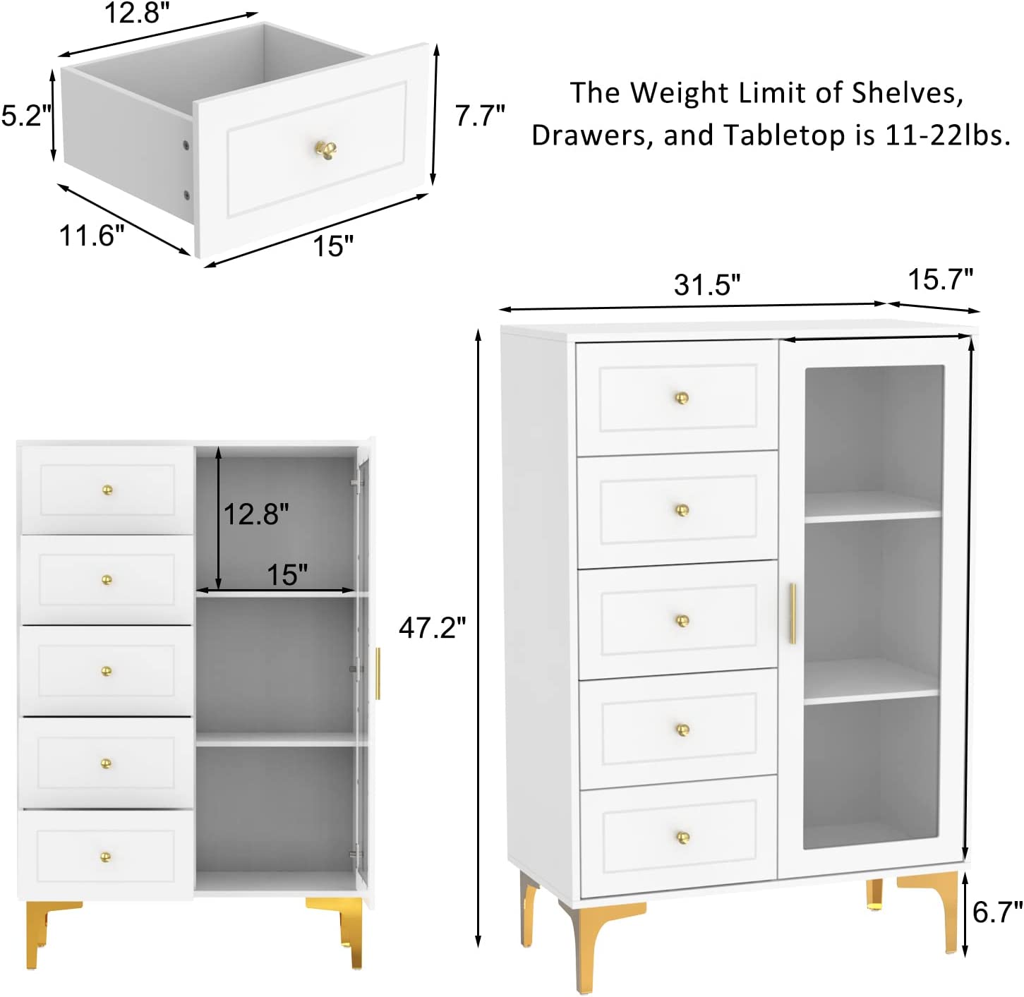 【Large Capacity】This storage cabinet with 5 drawers and 3-tier shelves provides additional storage space to your home, the tabletop can also hold many items. The glass door allows you to display your collections. Overall sizes: 31.5”W x 15.7”D x 47.2”H, for more specific sizes of the drawers and the shelves please refer to the size photo.