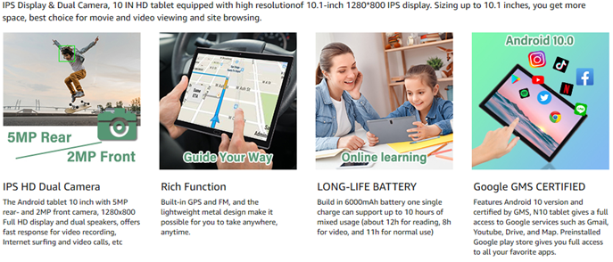 N10 Tablets is a New Release Version this year. It Featuring with a 10 inch HD display, Android 10.0, 2GB RAM, 32GB ROM, Qcta-core processor, 2.4G WIFI, 5MP/2MP cameras. Delivers the perfect mix of power, portability and performance - flawlessly running games and apps, as well as quicker loads of web pages, Free thousands of apps. Its large-capacity 5000mAh battery can effortlessly support you for up to 15 hours of Browsing, Watching Movies and Playing games,Reading, Photograph, videos, Music or surfing the Internet.
