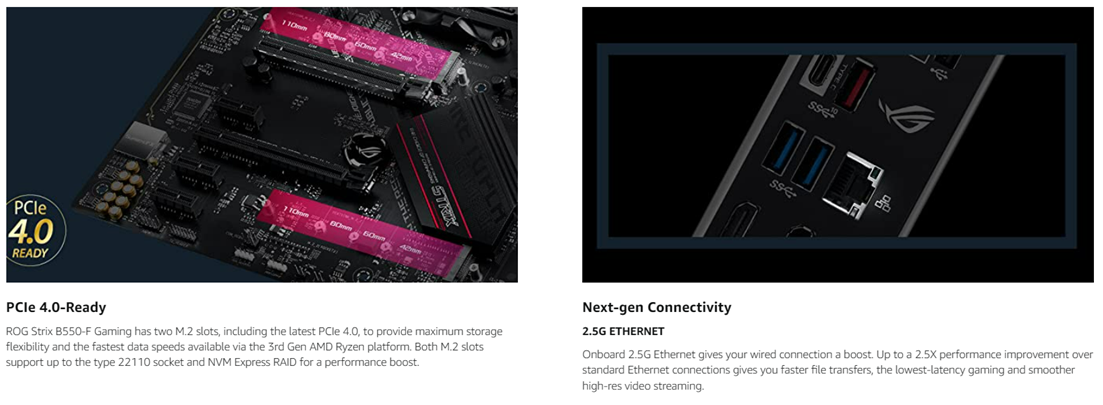 Note: Products with electrical plugs are designed for use in the US. Outlets and voltage differ internationally and this product may require an adapter or converter for use in your destination. Please check compatibility before purchasing.Experience next-level performance and connectivity with the ROG Strix B550-F Gaming, featuring PCIe 4.0 and 2.5Gb Ethernet. Robust power and effective cooling make the ROG Strix B550-F Gaming the perfect partner for 3rd Gen AMD Ryzen CPUs.