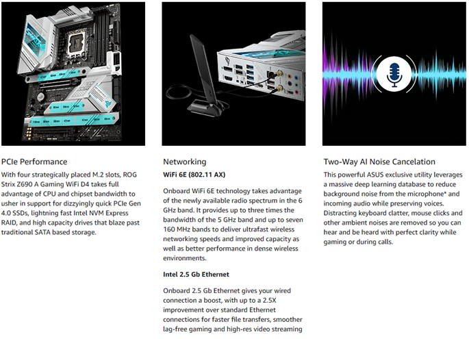 - AI Motherboard : AI Overclocking, AI cooling, AI networking(GameFirst VI) and AI noise cancellation