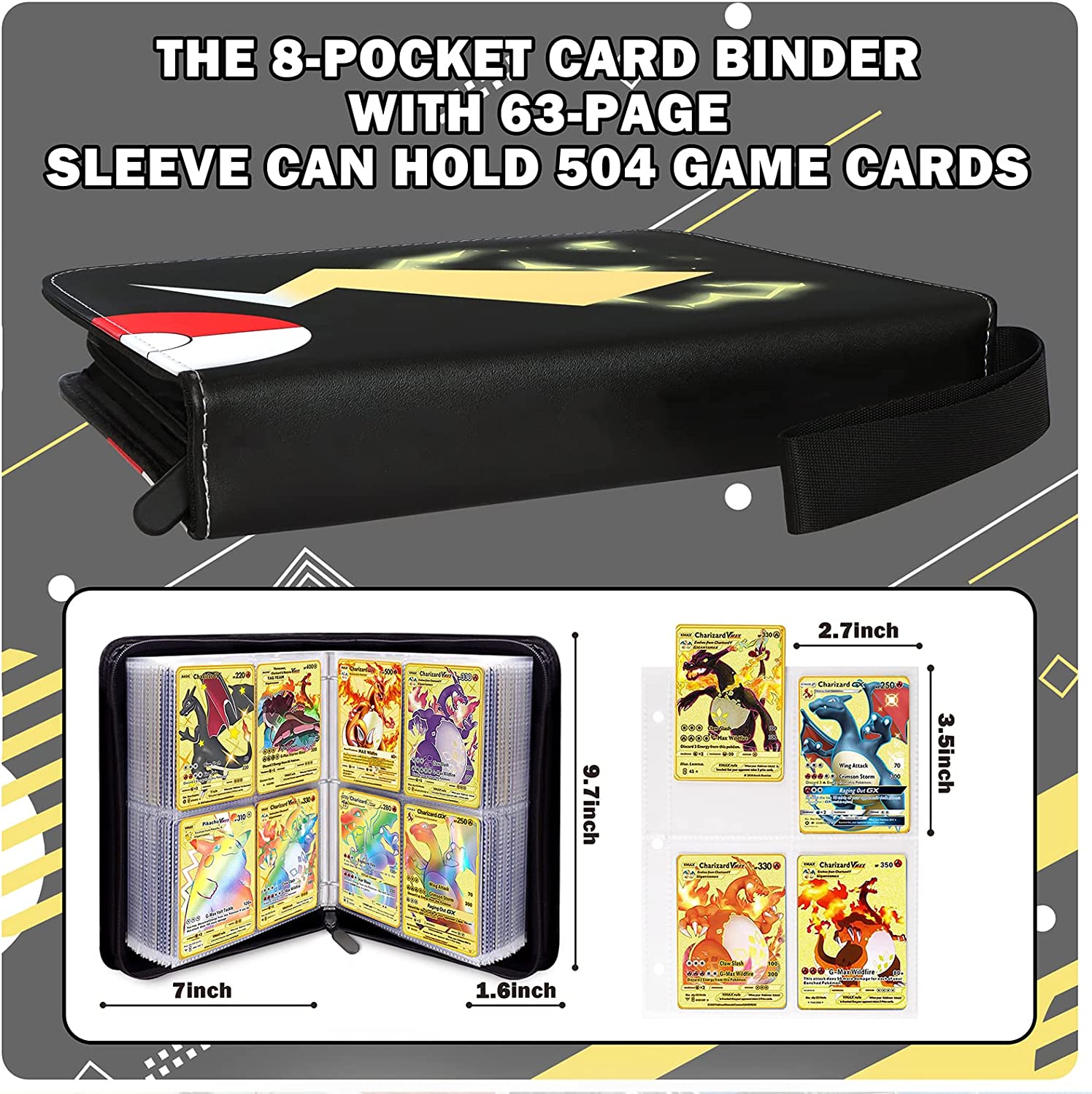 Black Card Binders for Pokemon Cards 4 Pocket - Hold 504 Game Cards with 63 Sleeves, Trading Card Collection Zipper Binder Holder for Kids Gifts