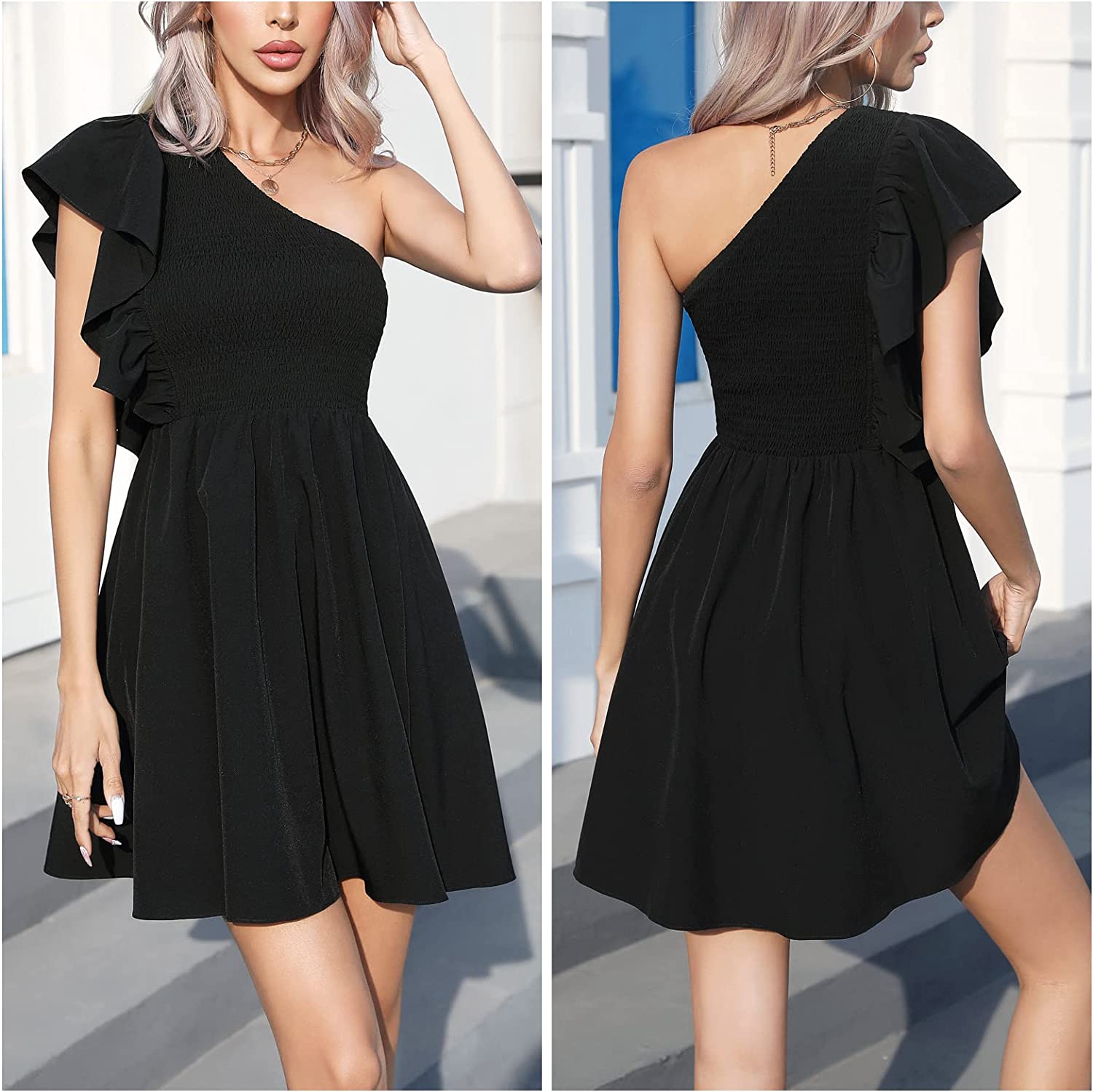 Byinns Women's 2023 Summer One Shoulder Cocktail Dress Ruffle Sleeveless Smocked Dress Party Wedding Guest Mini Dresses