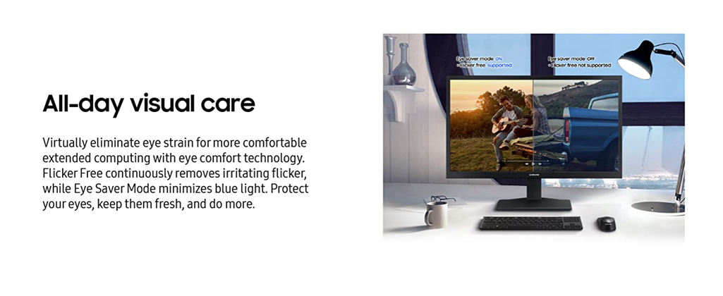 - ALL DAY EYE CARE: Virtually eliminate eye strain for more comfortable extended computing with eye comfort technology; Flicker Free continuously removes irritating flicker, while Eye Saver Mode minimizes blue light; Protect your eyes, keep them fresh, and do more.